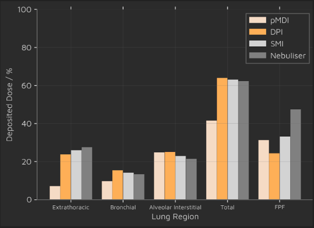Links formulation, aerosol dynamics, and device outputs to delivered dose.